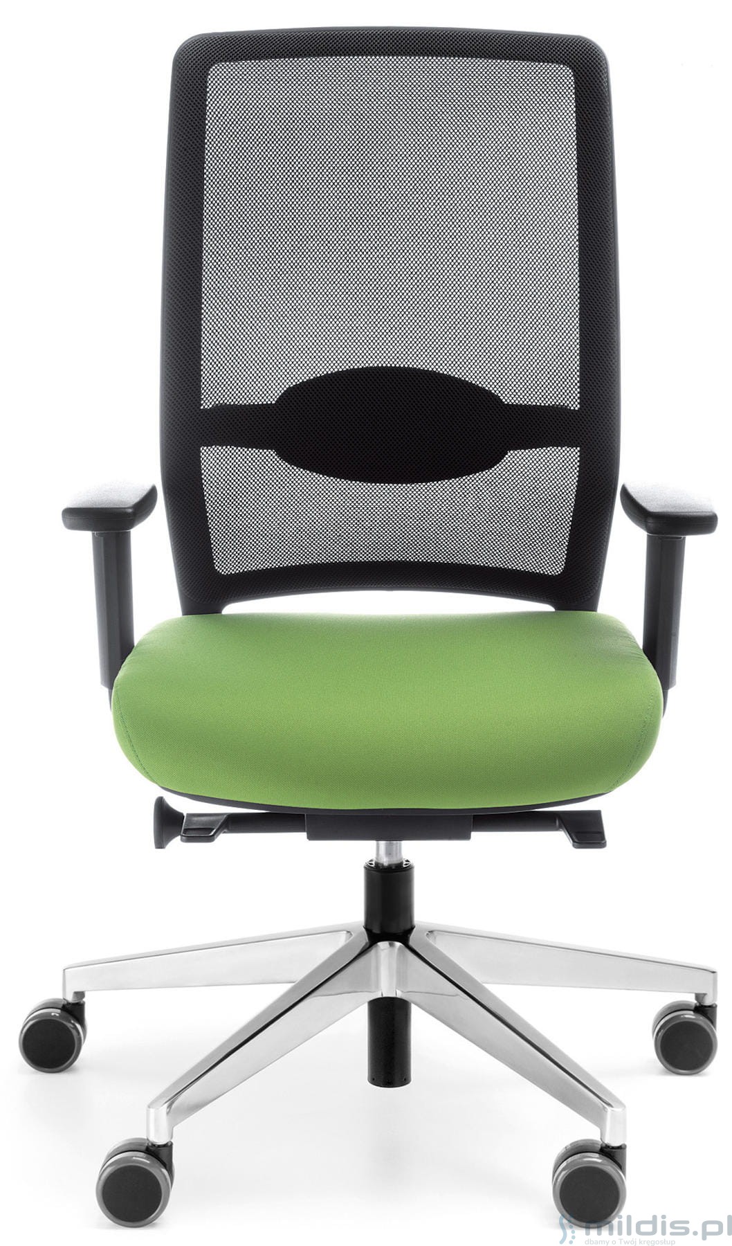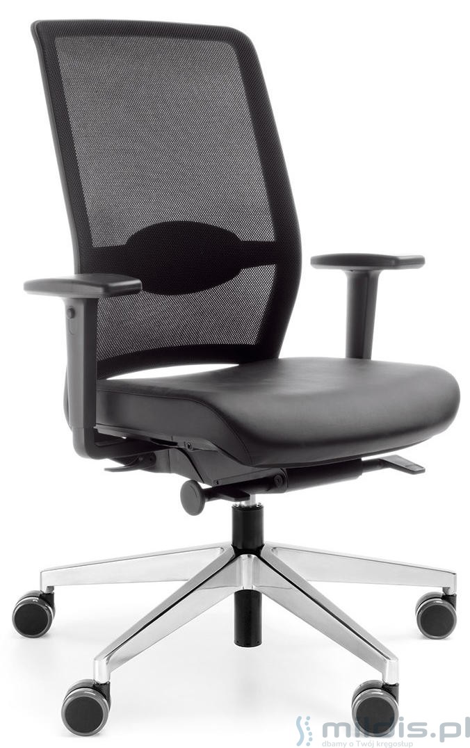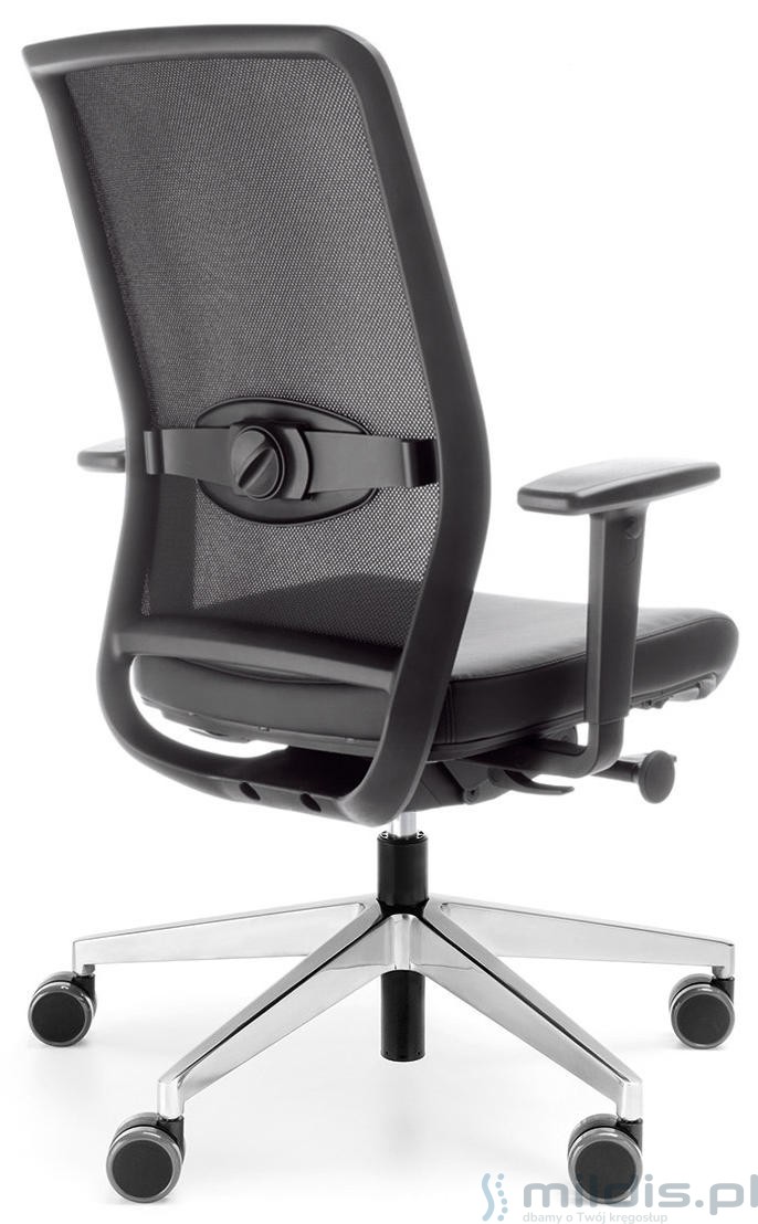 Wysokie oparcie obszyte bardzo wytrzymałą siatką materiałową. Zapewnia bardzo dobrą wentylację ciała w czasie siedzenia. Oparcie wyposażyć można (opcja dodatkowa) w specjalne, regulowane podparcie odcinka lędźwiowego pleców. Rozwiązanie to zapewnia stabilizację placów i zmniejsza obciążenie kręgosłupa w czasie siedzenia.
