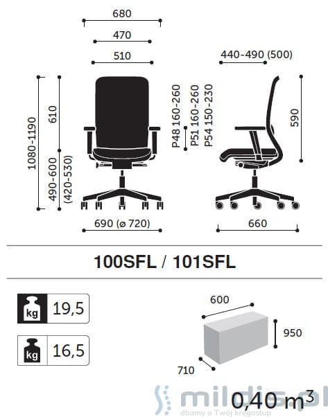 Podłokietnik P48 – regulowany: góra-dół w zakresie 100 mm, odległość od siedziska w zakresie 35 mm na stronę, nakładka obrotowa (+/- 30°), nakładka przód-tył (+/- 30 mm)