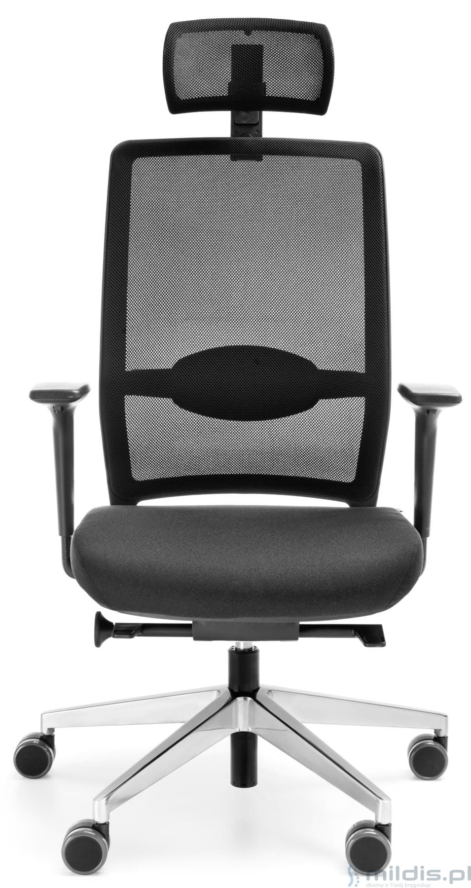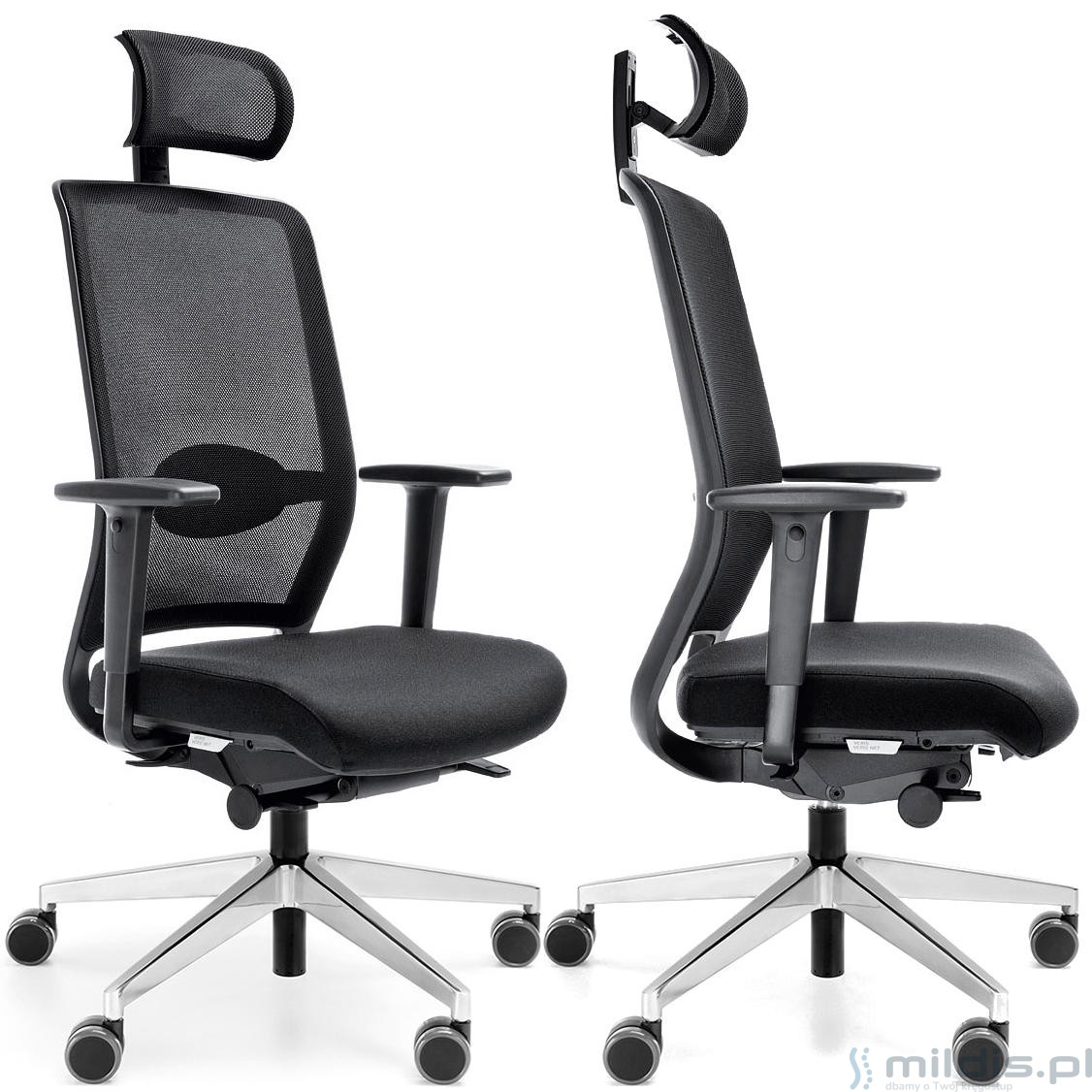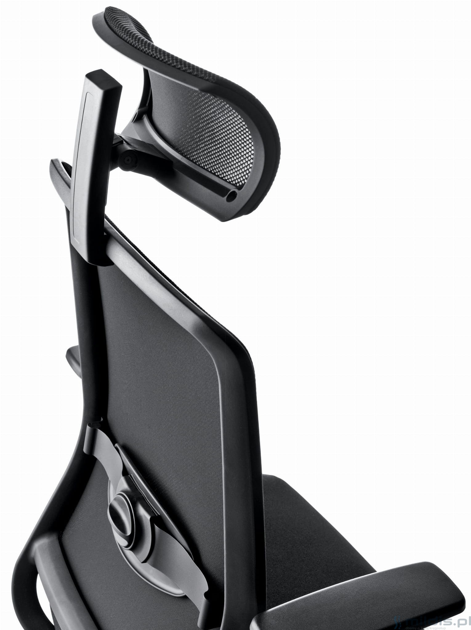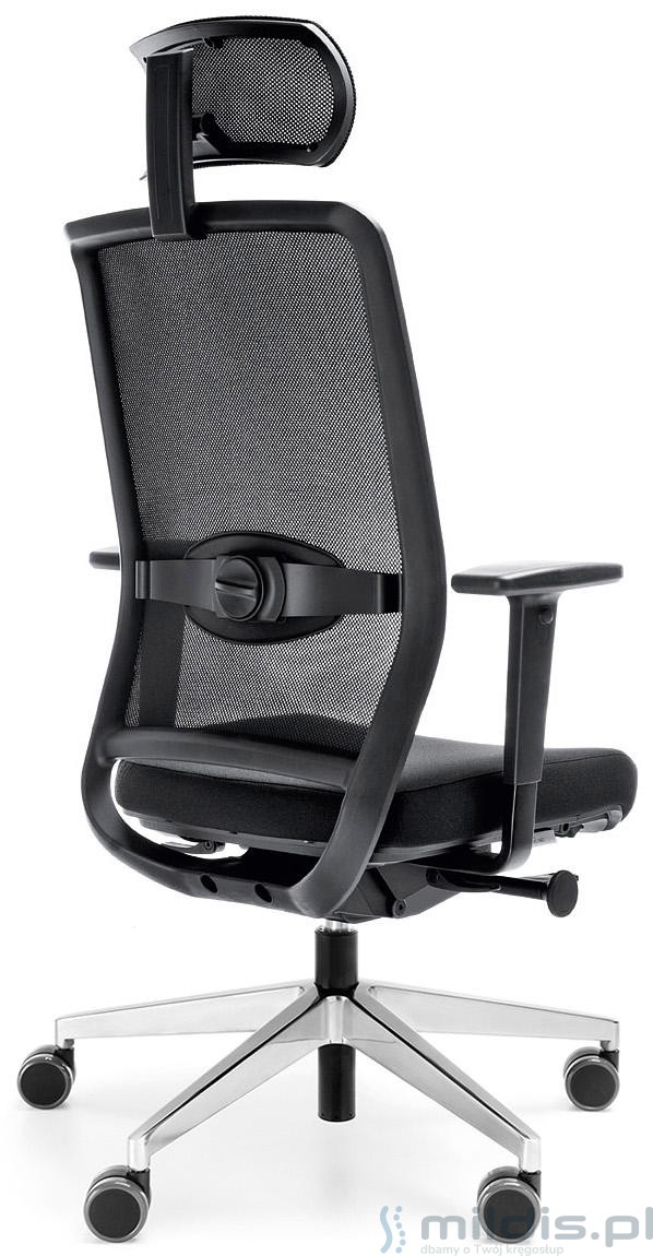 Wysokie oparcie zakończone zagłówkiem. Oba elementy są obszyte bardzo wytrzymałą siatką materiałową. Zapewnia świetną wentylację ciała w trakcie siedzenia. Oparcie może dodatkowo posiadać regulowane podparcie odcinka lędźwiowego pleców. Rozwiązanie to zapewnia stabilizację placów i zmniejsza obciążenie kręgosłupa w czasie siedzenia.