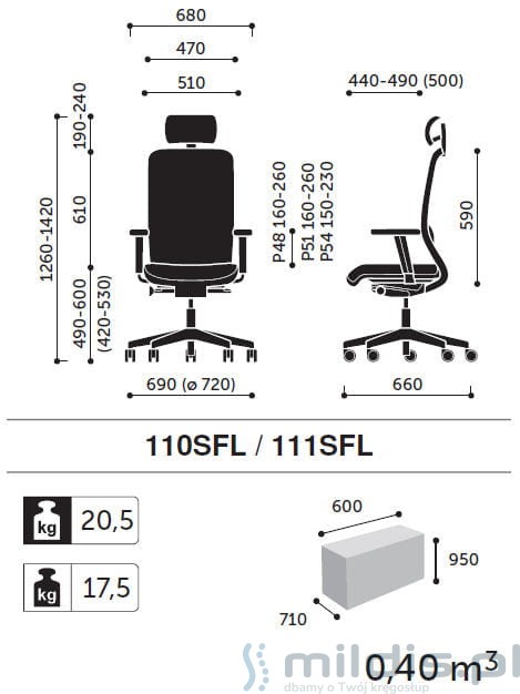 Wymiary fotela Veris Net 110-111SFL