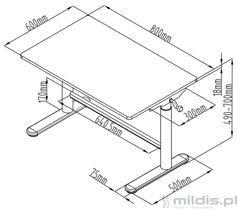 Łatwa, manualna regulacja wysokości biurka za pomocą małej korbki. Wysokość blatu można ustawić w zakresie: 49 cm - 70 cm. Biurko można więc dostosować dla dzieci już od około 4 roku życia (od około 110 cm wzrostu) aż do około 150 cm wzrostu (w zależności od wysokości siedziska krzesła).