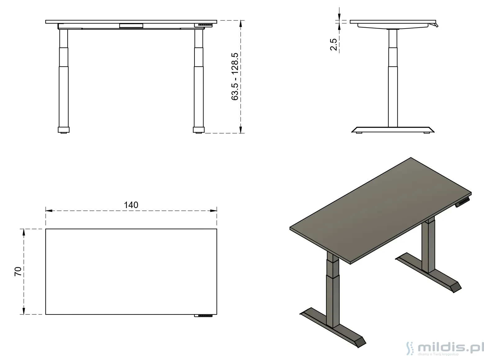 Elektryczna regulacja wysokości blatu w zakresie 63,5 - 128,5 cm.