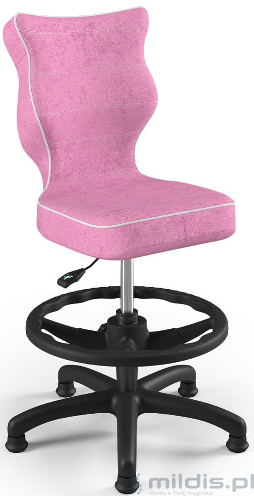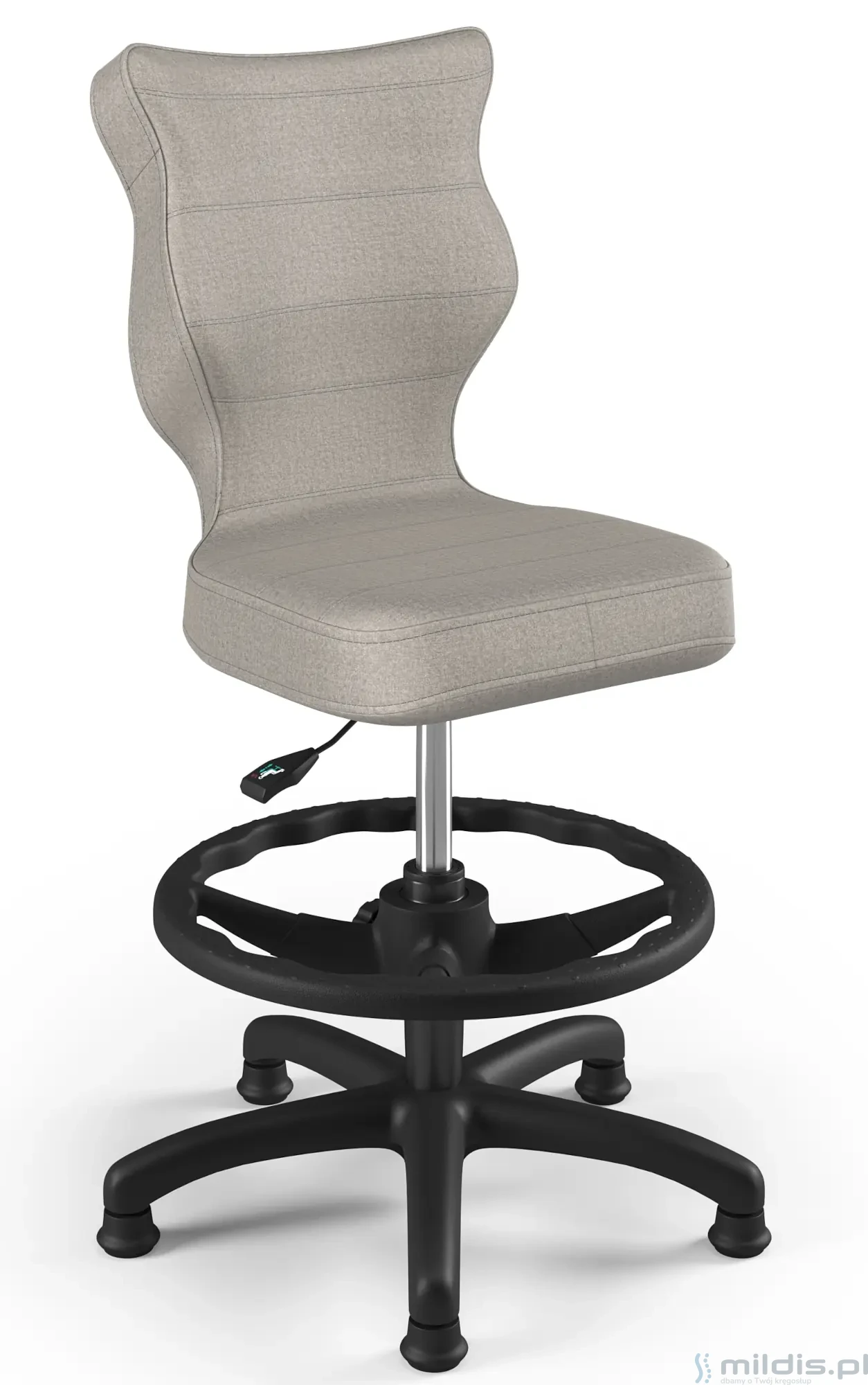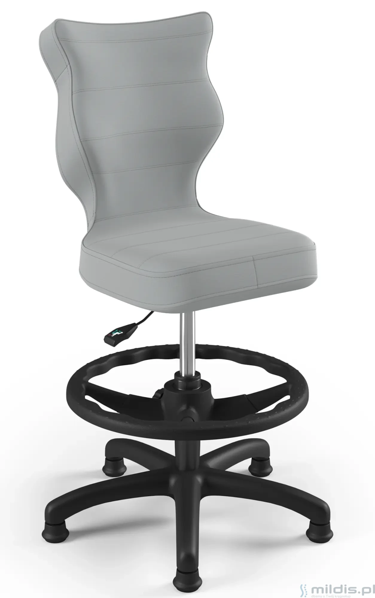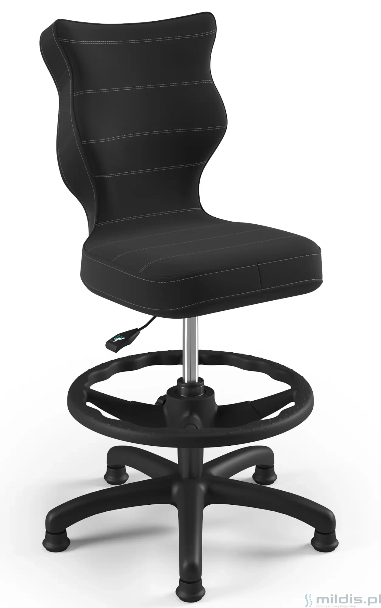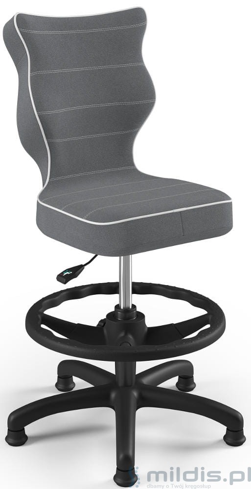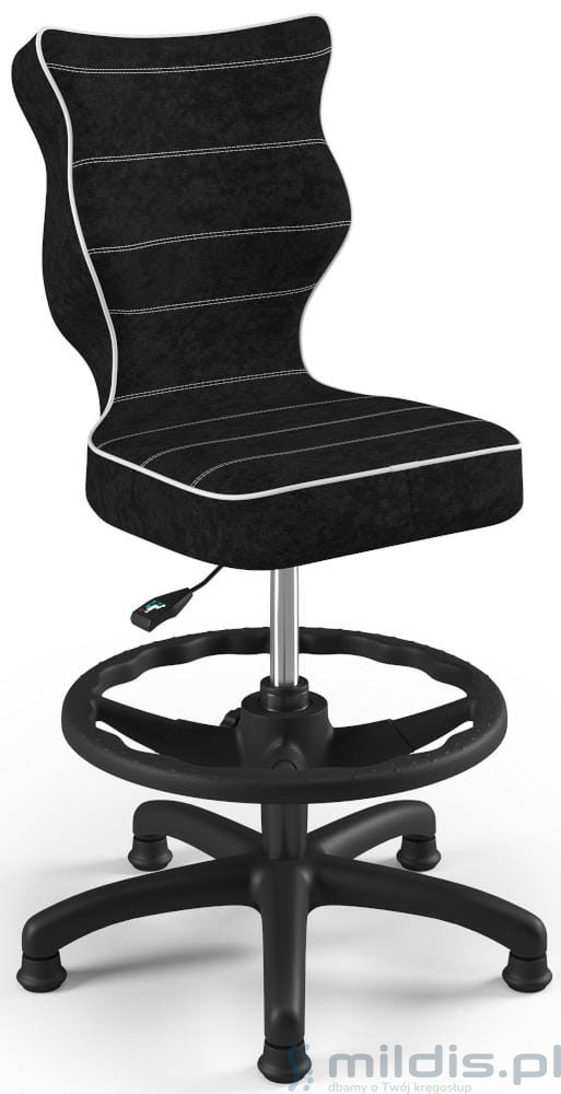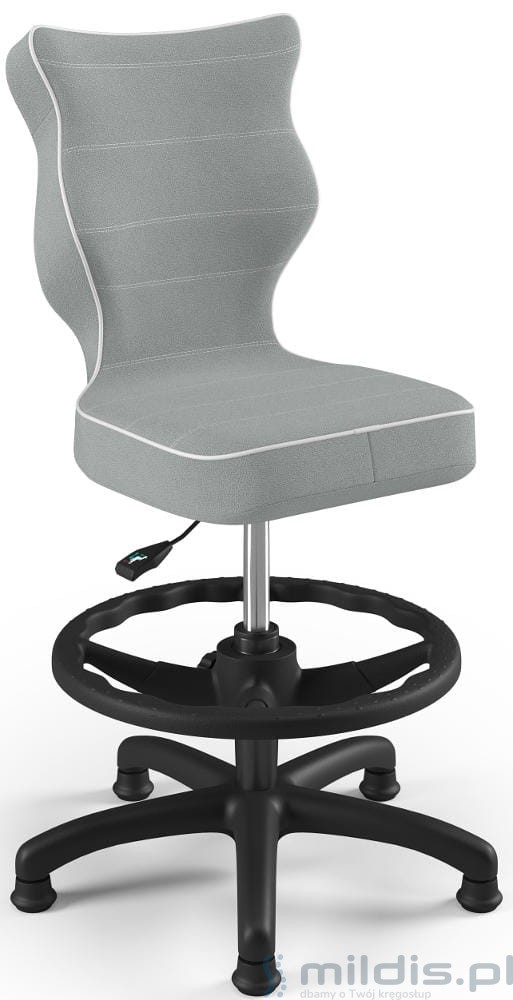 Krzesło do biurka Entelo Petit Black posiada specjalną konstrukcję - z długim siłownikiem podnoszącym siedzisko. Dla zachowania prawidłowej, zdrowej postawy - oprócz ergonomicznego oparcia - posiada również regulowaną podstawkę pod stopy. Dzięki temu nawet podczas siedzenia przy wysokim biurku starsze dzieci mogą swobodnie oprzeć stopy.
