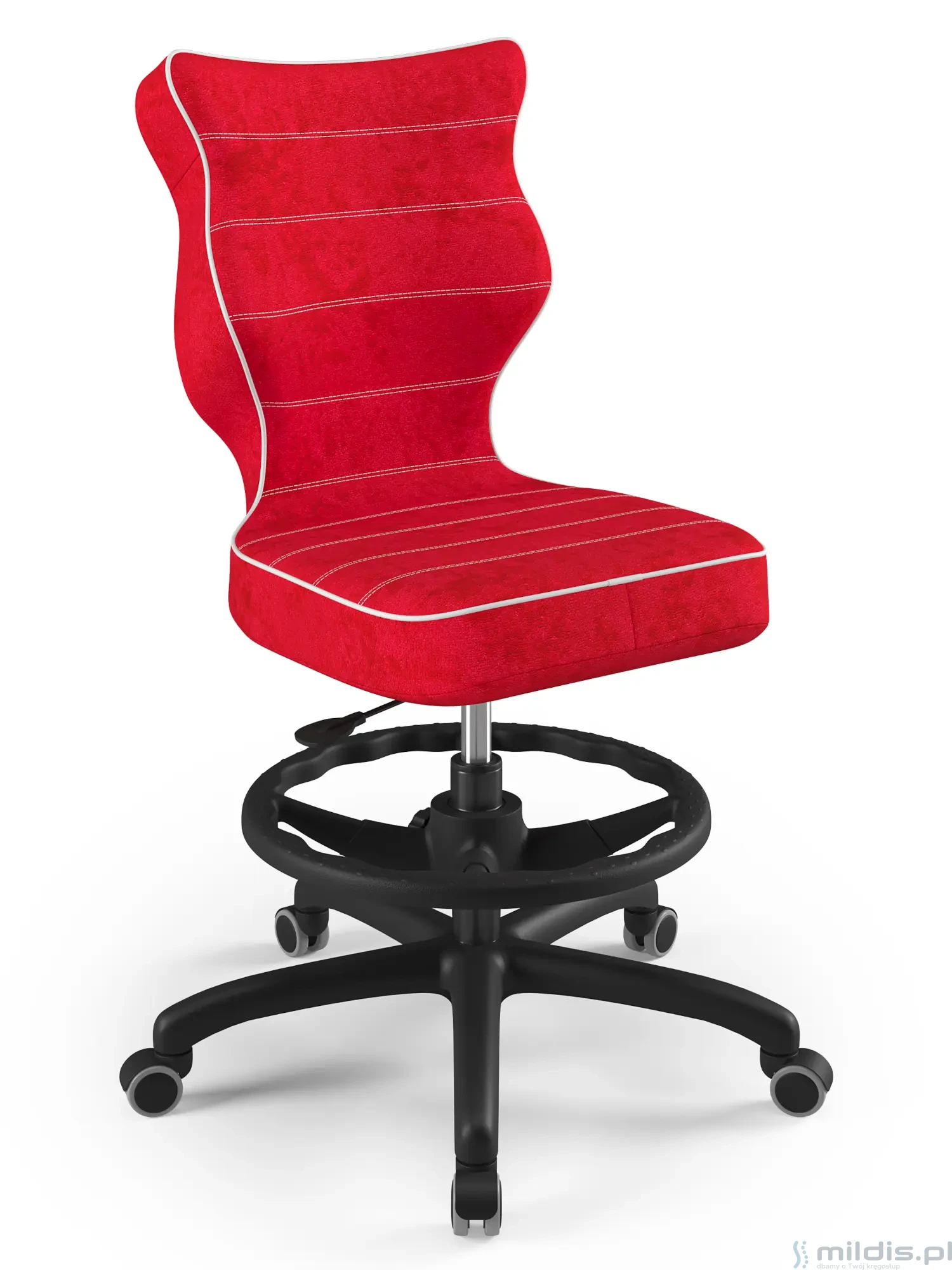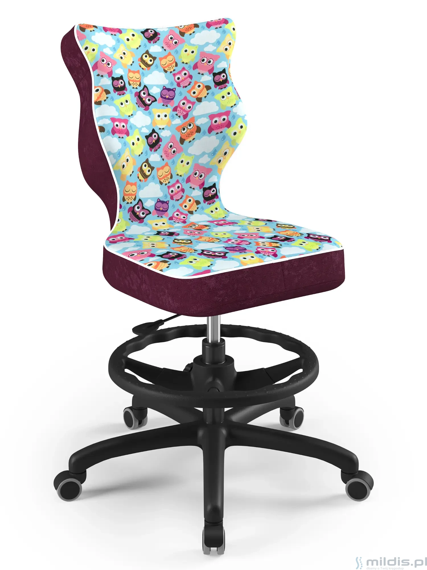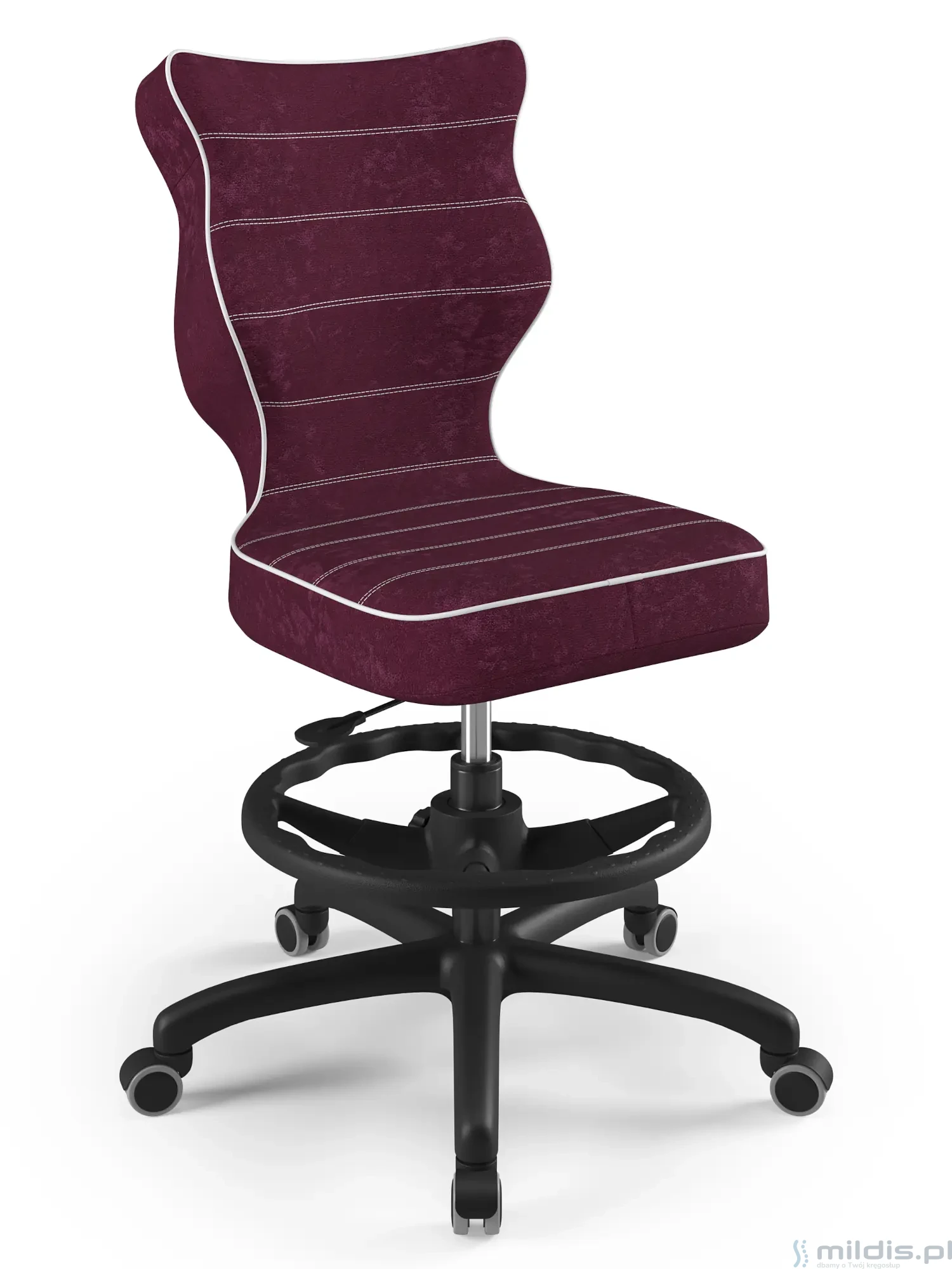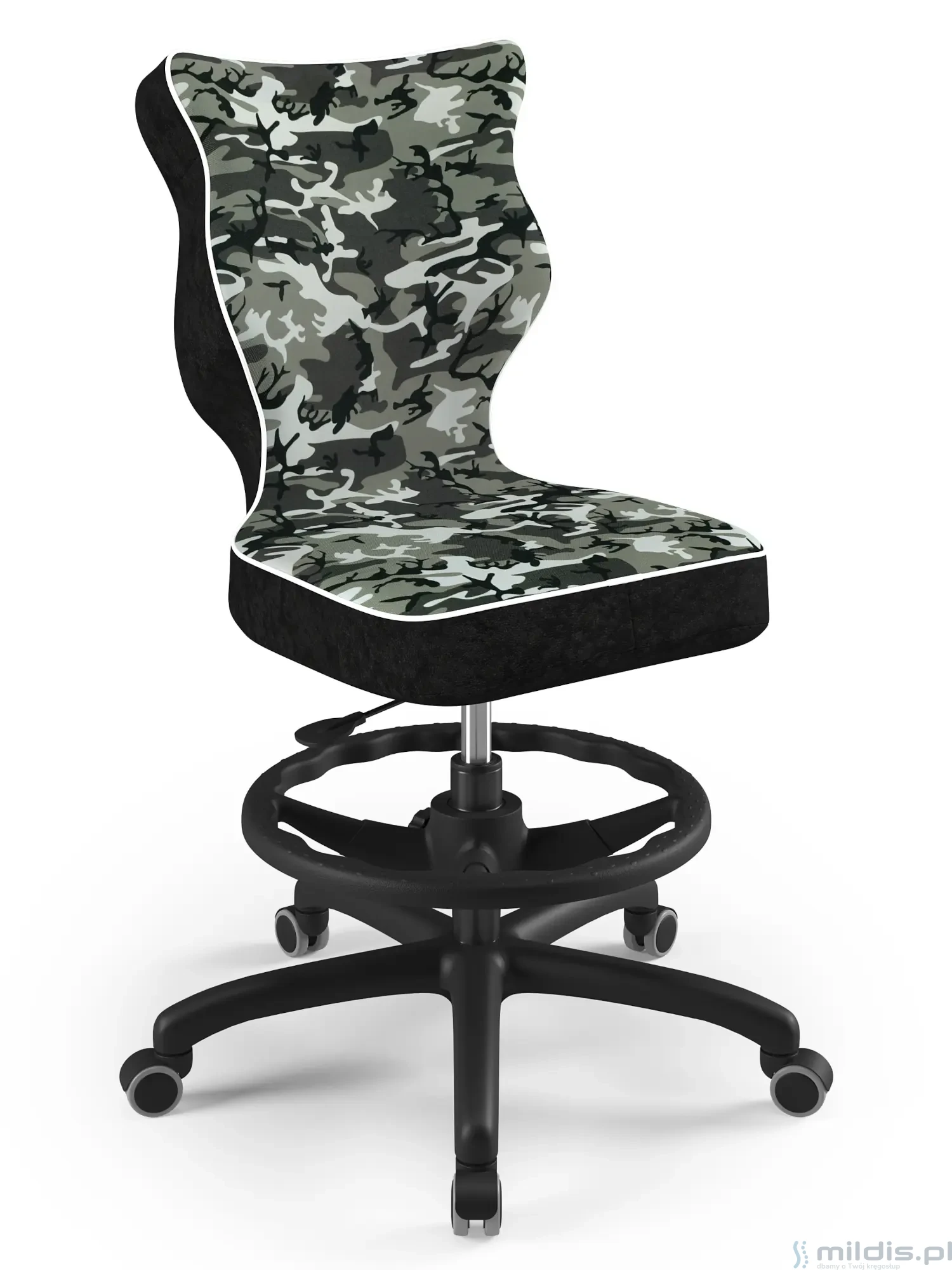Krzesło obrotowe Entelo Petit Black w wersji z regulowaną podstawką pod stopy sprawdzi się wtedy, gdy nastolatek ma na tyle wysokie biurko, że – po odpowiednio wysokim ustawieniu siedziska – nie będzie dostawał całymi stopami do podłogi. Wtedy oparciem dla nóg będzie taki okrągły podnóżek, który pomoże poprawić pozycję siedzącą, o którą zadba też wyraźnie wyprofilowane oparcie.