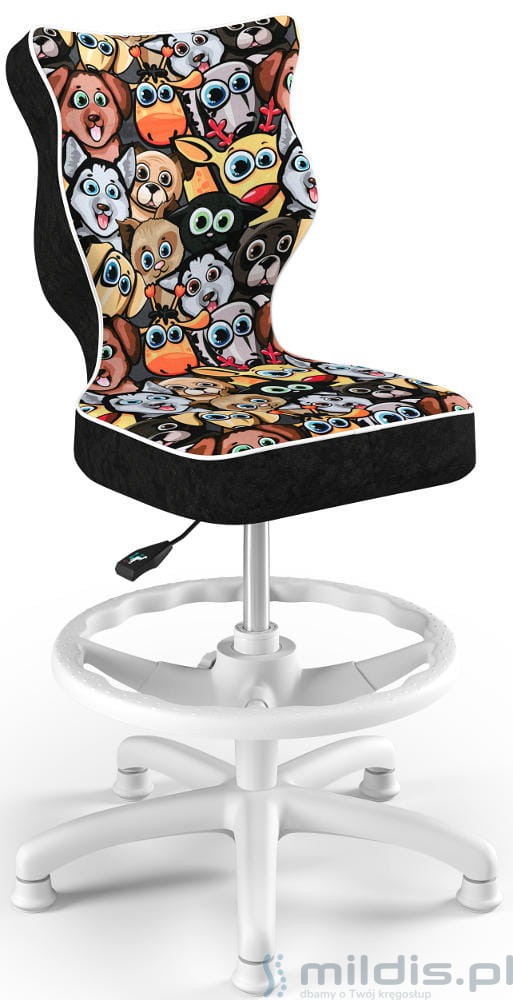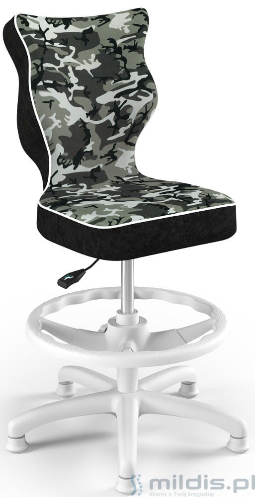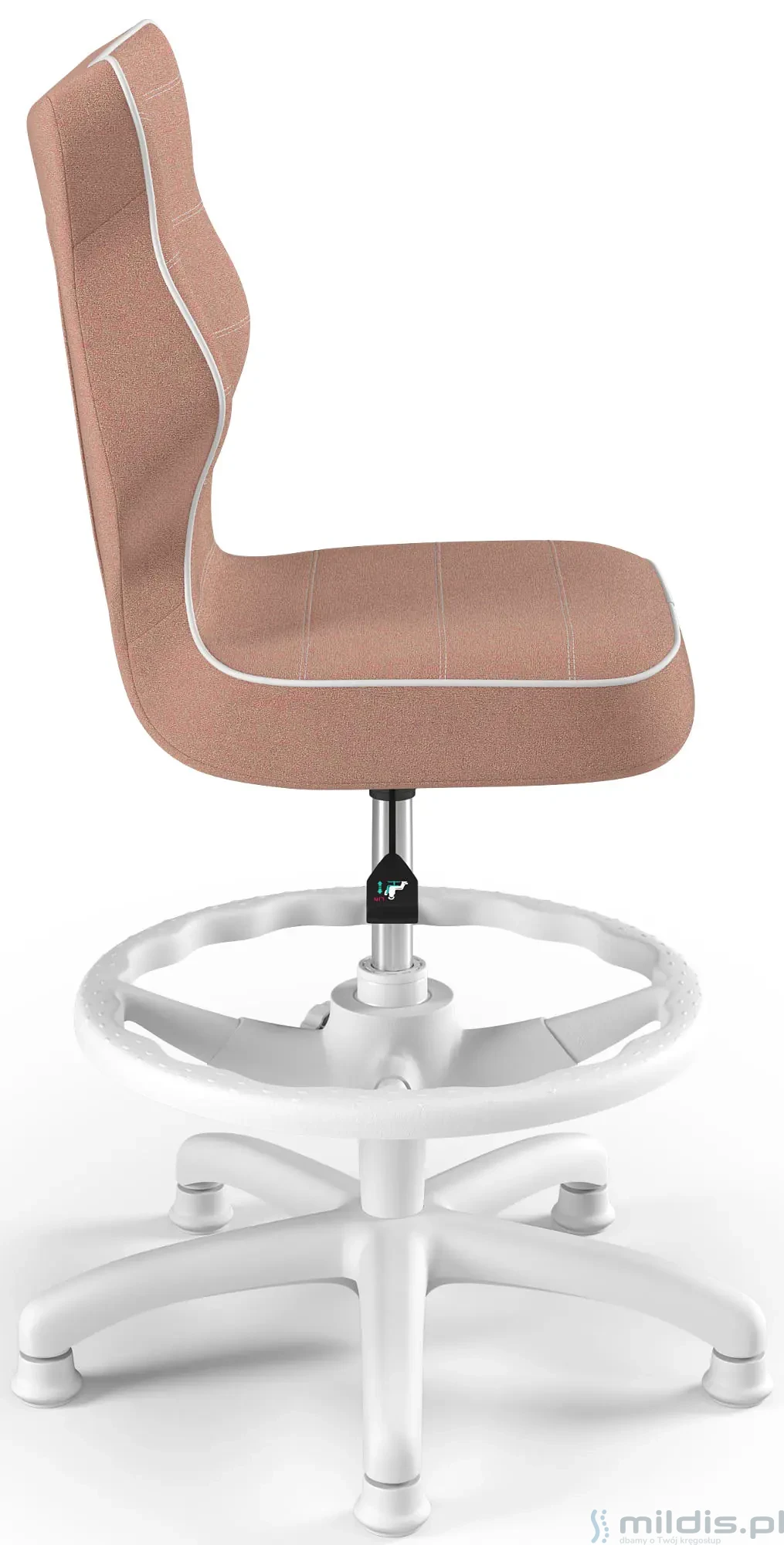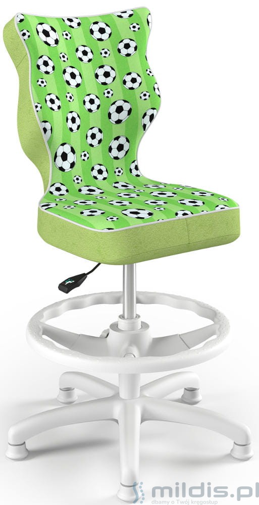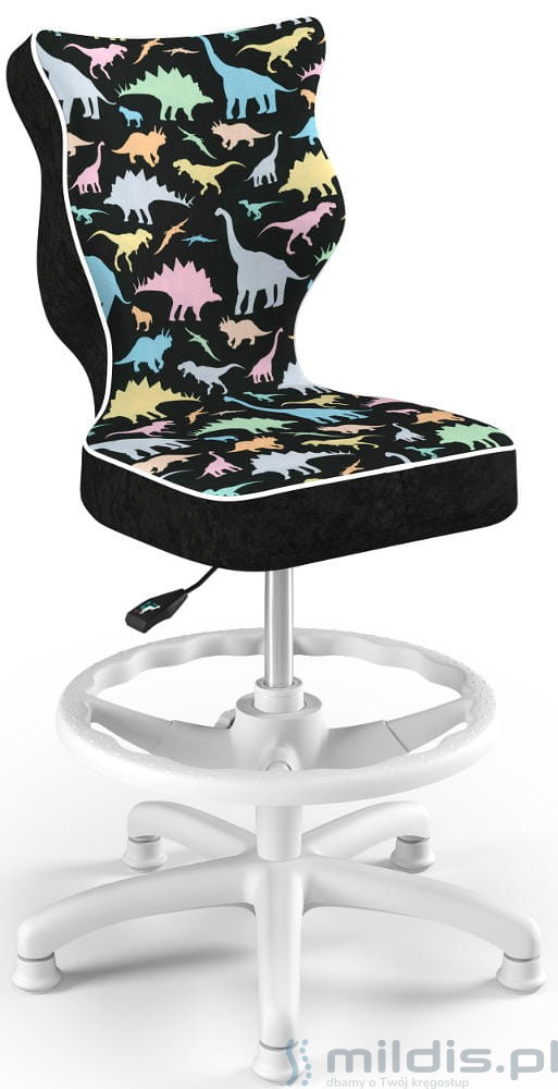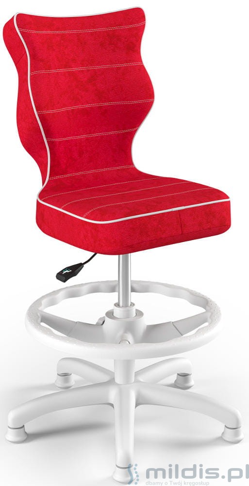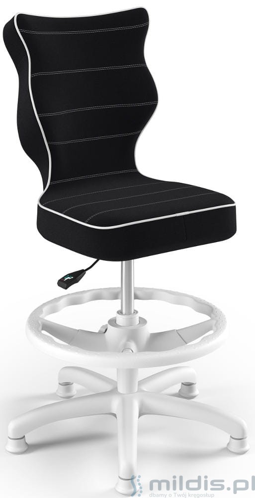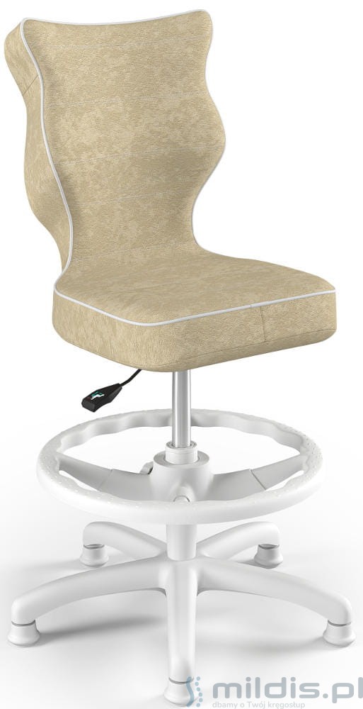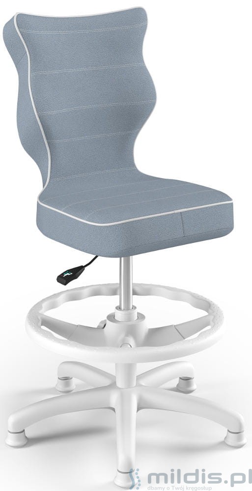 Krzesło do biurka Entelo Petit White w wersji z podnóżkiem posiada specjalny, długi siłownik. Dzięki temu siedzenie krzesła można podnieść na tyle wysoko, aby dziecko mogło siedzieć nawet przy wysokim biurku dla dorosłych. Nogi dziecka mogą się swobodnie oprzeć, ponieważ krzesło ma regulowaną podstawkę pod stopy.