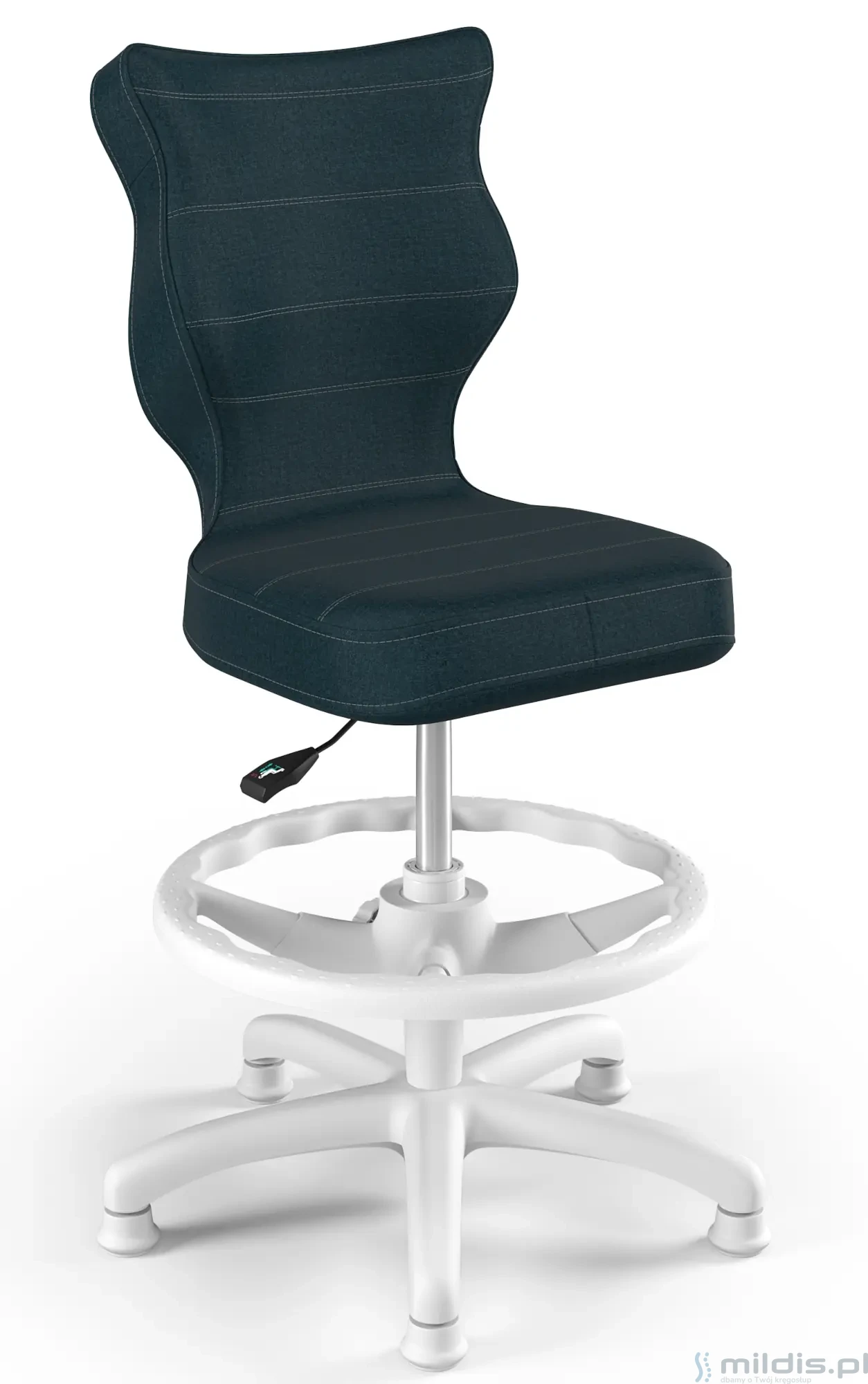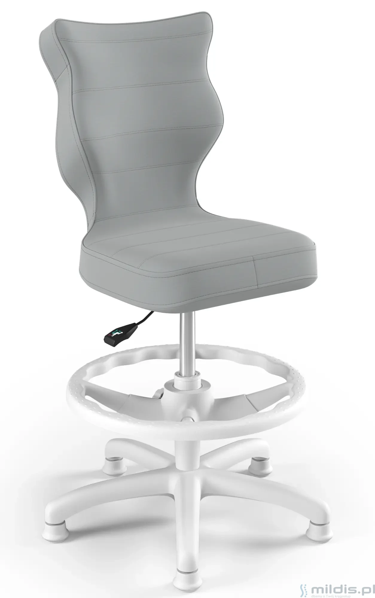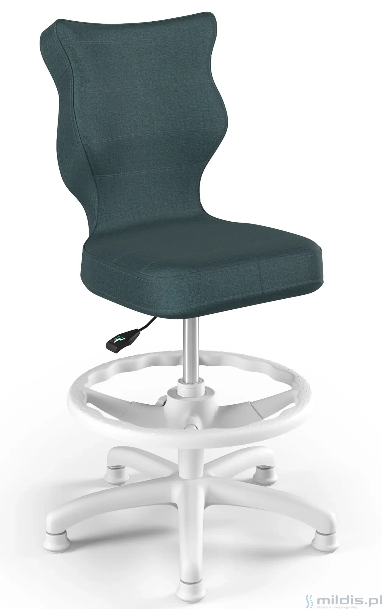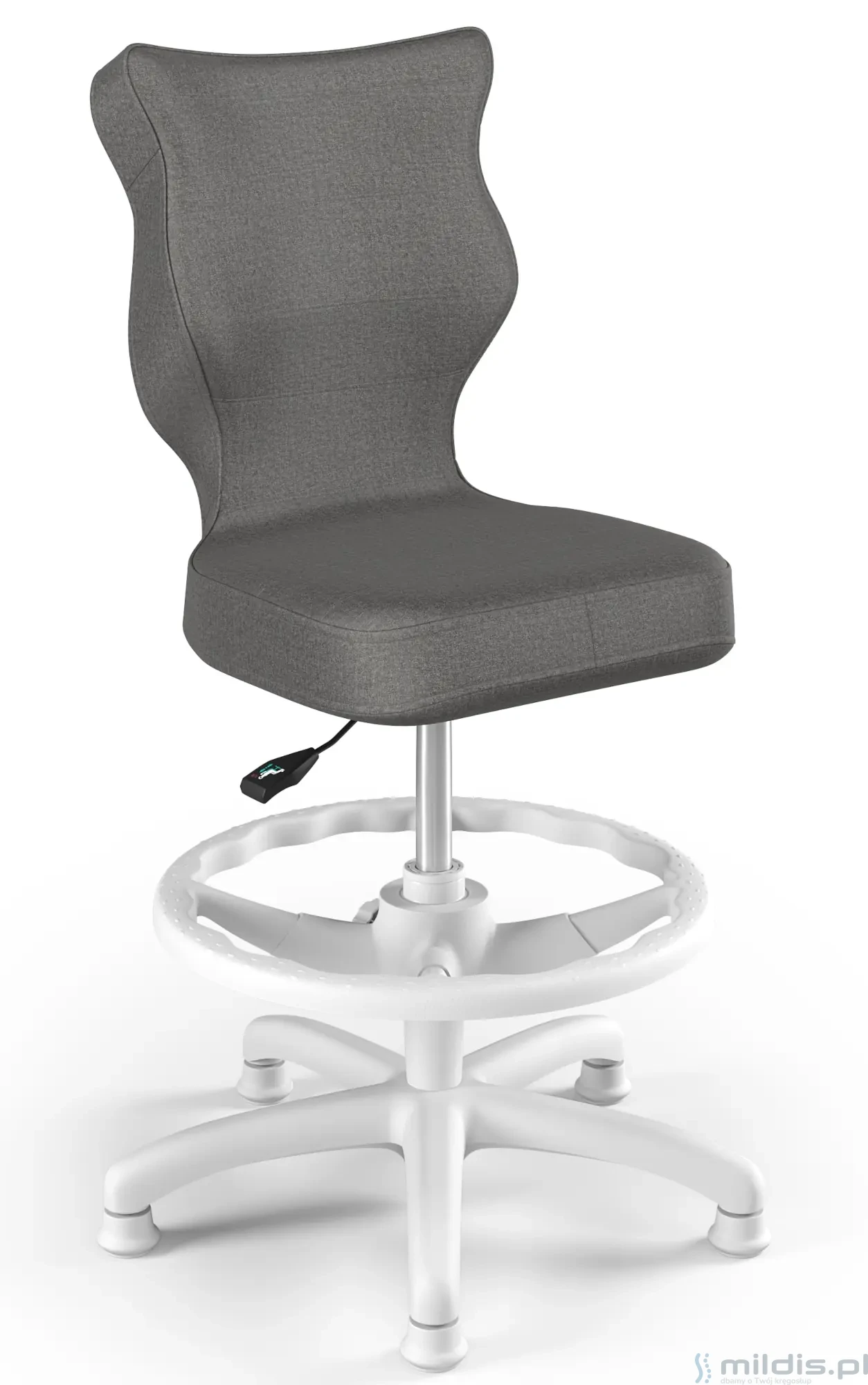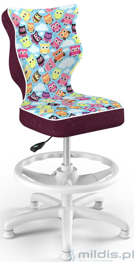 Krzesło do biurka Entelo Petit White w wersji z podnóżkiem posiada specjalny, długi siłownik. Dzięki temu siedzenie krzesła można podnieść na tyle wysoko, aby dziecko mogło siedzieć nawet przy wysokim biurku dla dorosłych. Nogi dziecka mogą się swobodnie oprzeć, ponieważ krzesło ma regulowaną podstawkę pod stopy.