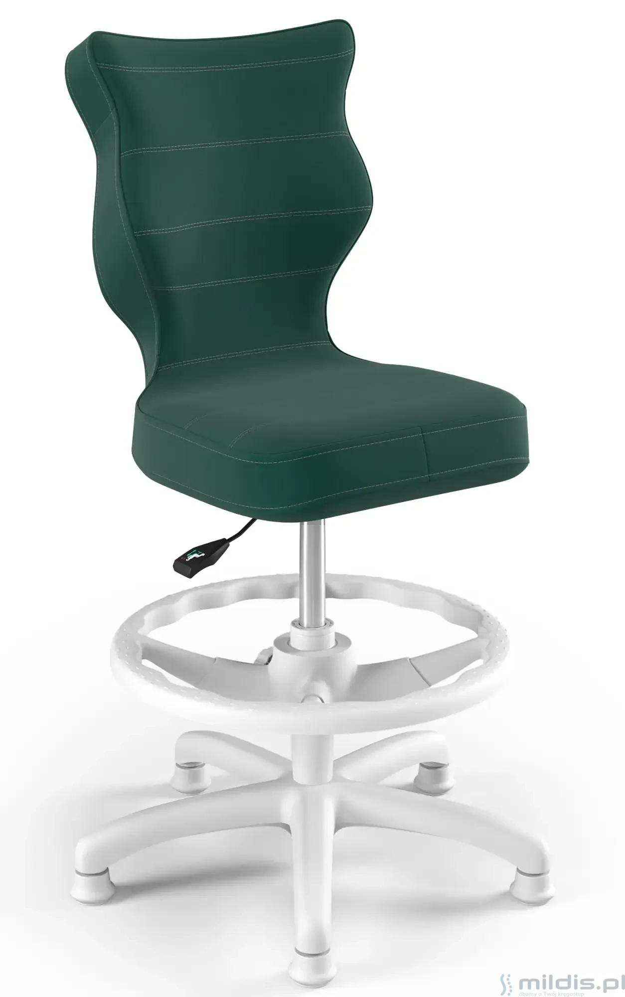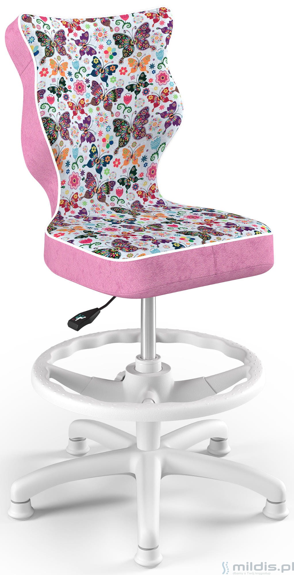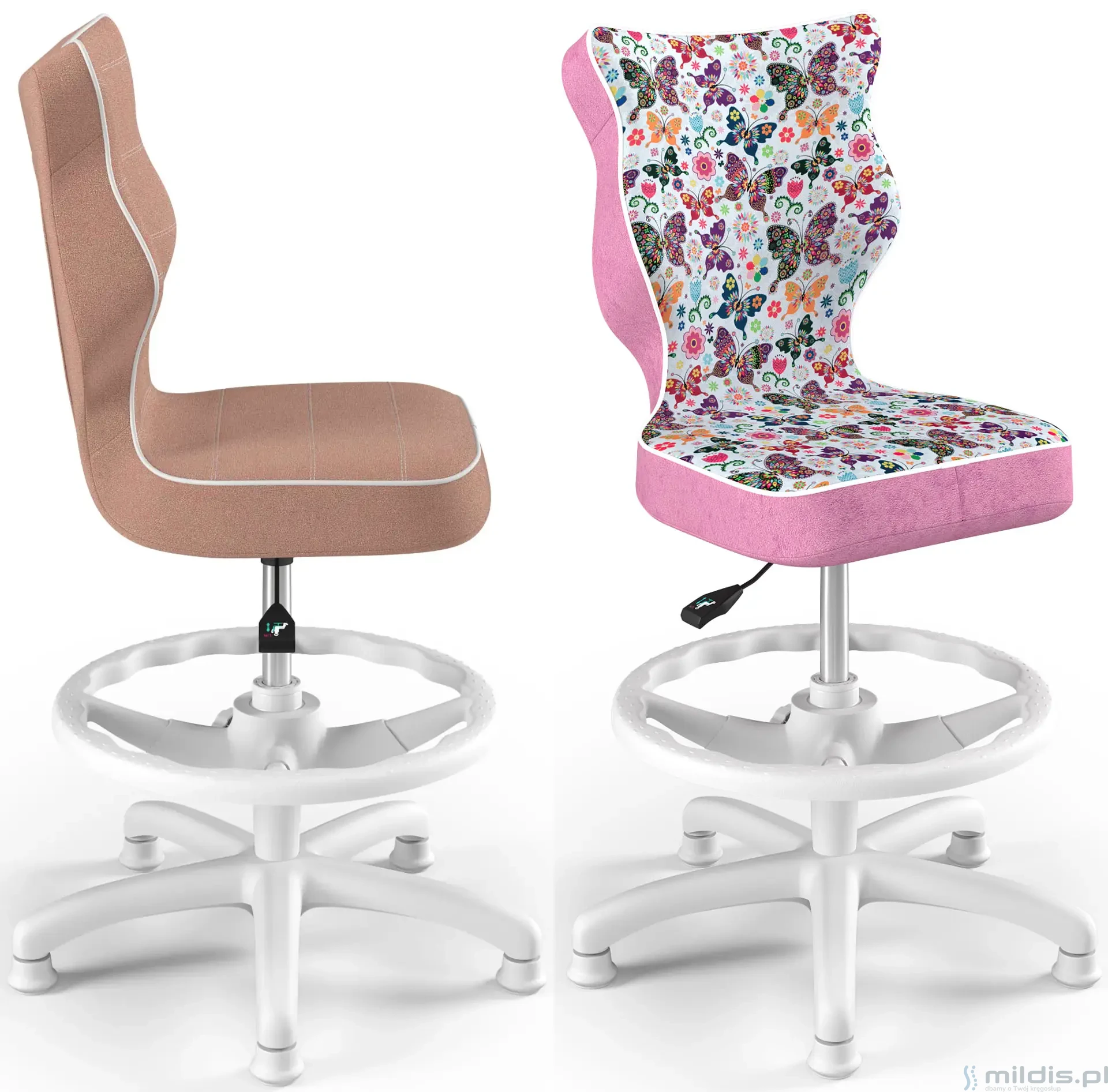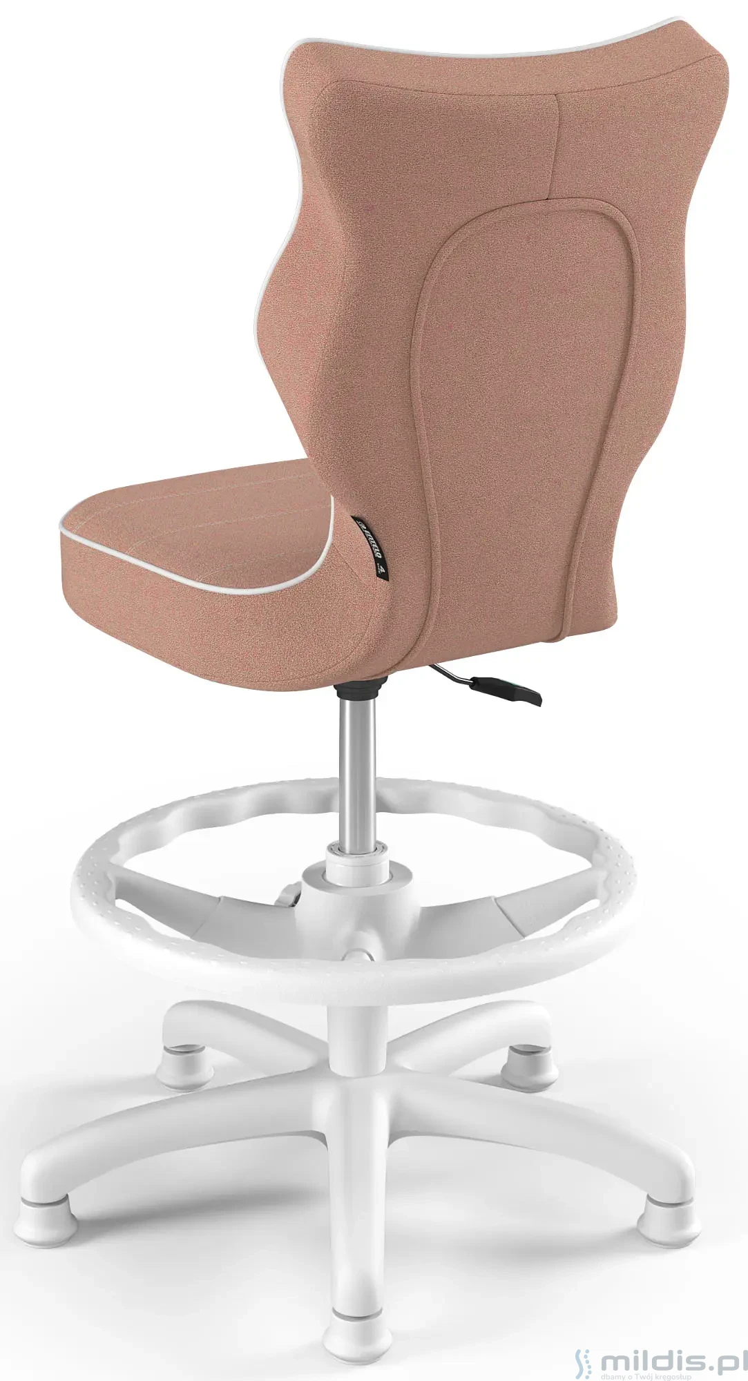 Krzesło do biurka Entelo Petit White w wersji z podnóżkiem posiada specjalny, długi siłownik. Dzięki temu siedzenie krzesła można podnieść na tyle wysoko, aby dziecko mogło siedzieć nawet przy wysokim biurku dla dorosłych. Nogi dziecka mogą się swobodnie oprzeć, ponieważ krzesło ma regulowaną podstawkę pod stopy.