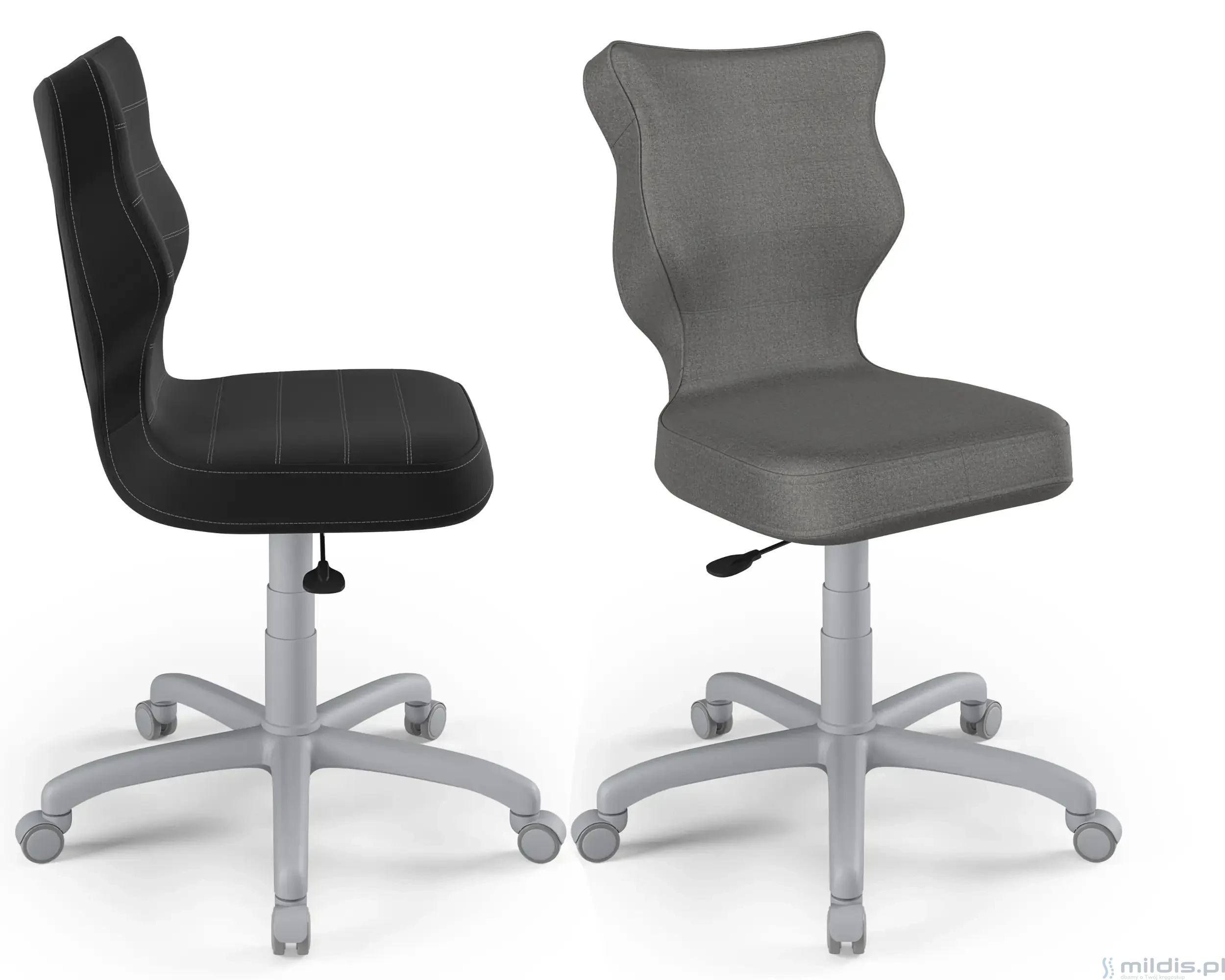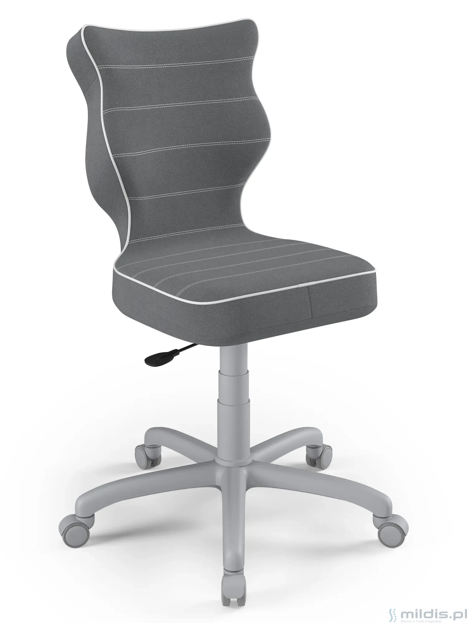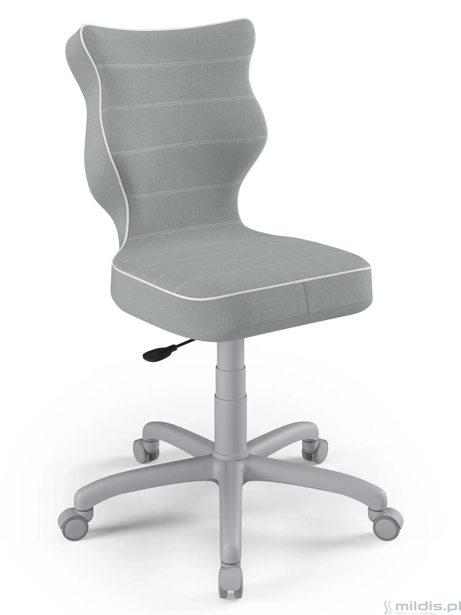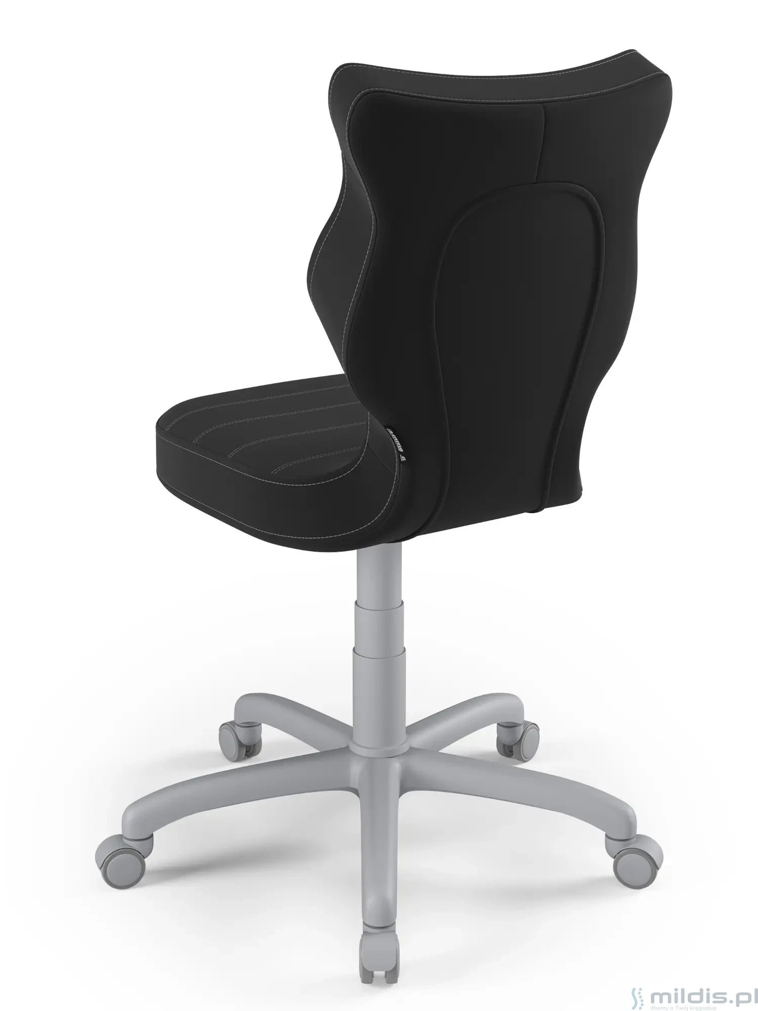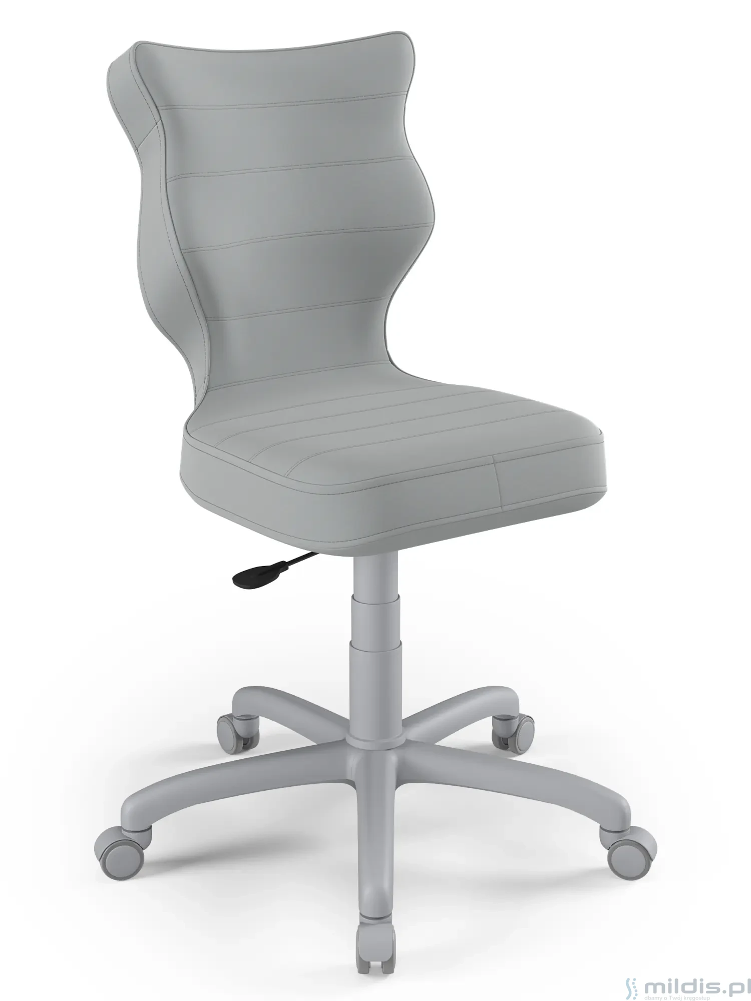 Obrotowe krzesło dla młodzieży Entelo Petit Grey to prosta, niezawodna konstrukcja z bardzo mądrze zaprojektowanym kształtem oparcia. Dzięki swym kształtom dobrze wspiera plecy u starszych dzieci zapobiegając nadmiernemu pochylaniu się, garbieniu i przechylaniu na boki podczas siedzenia.