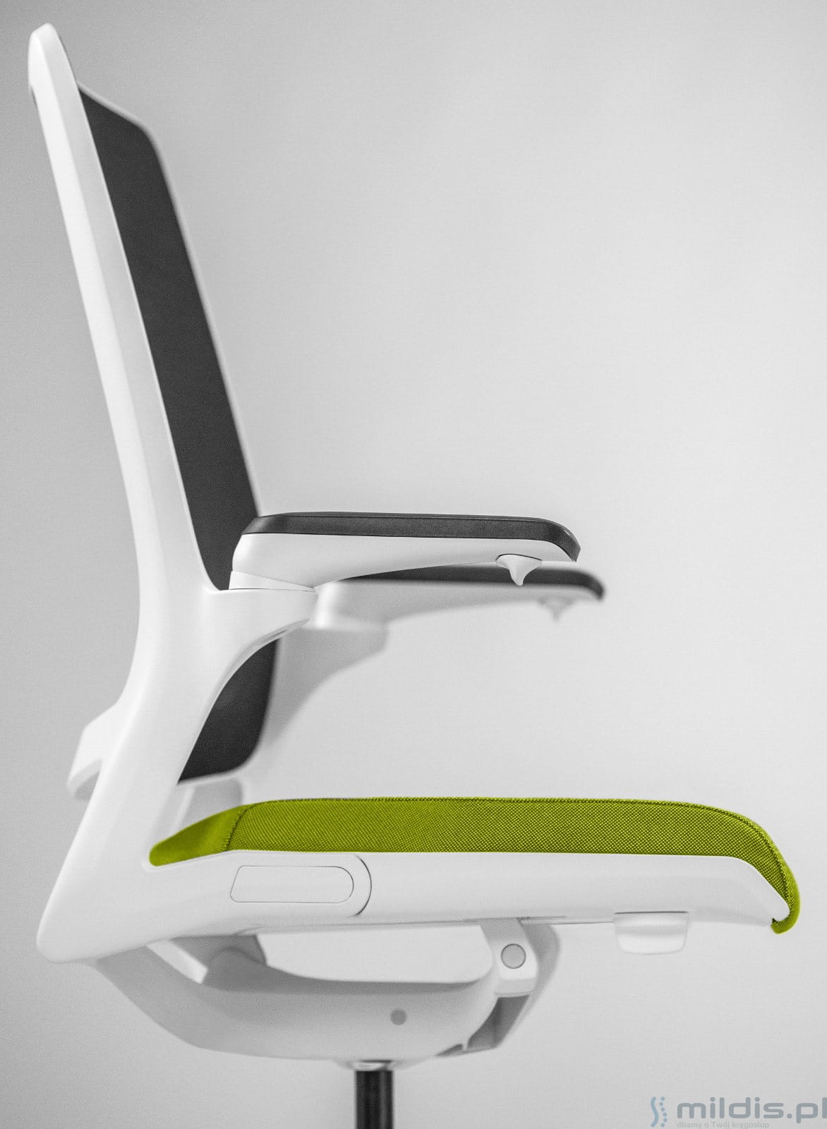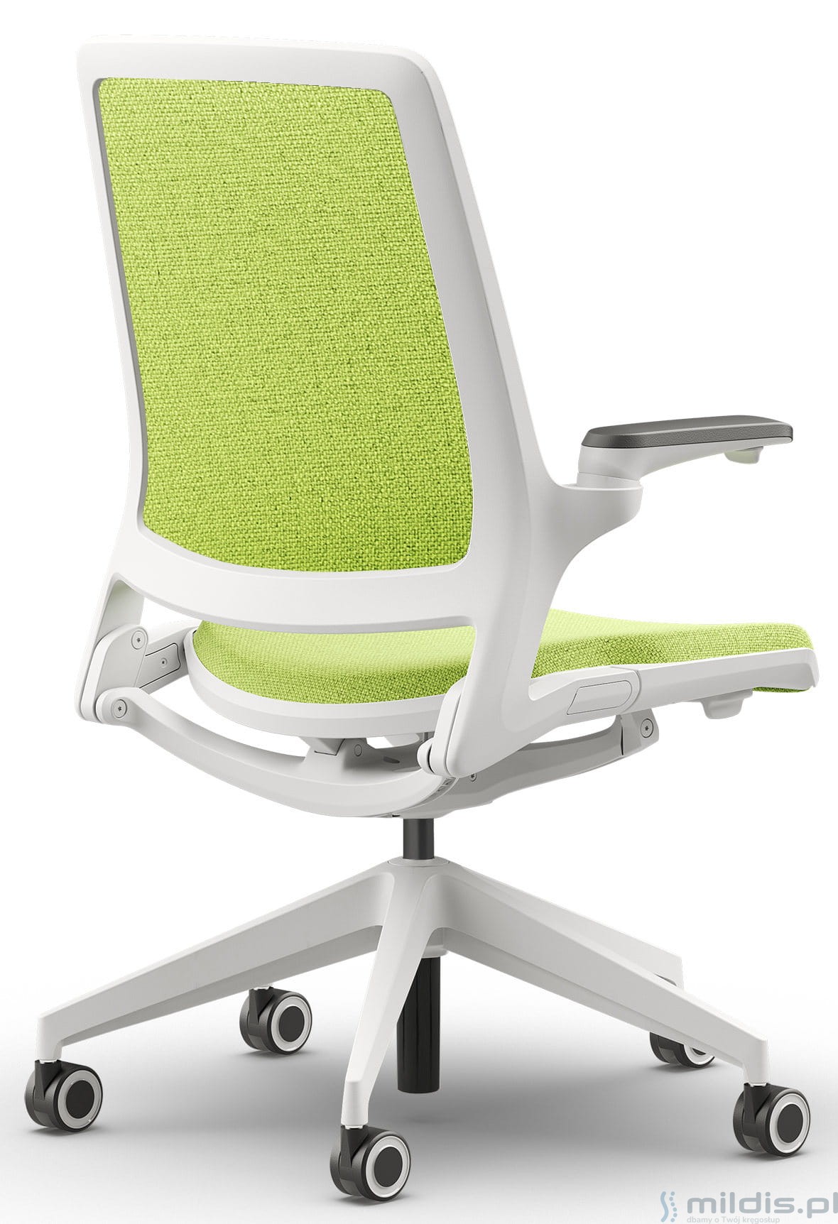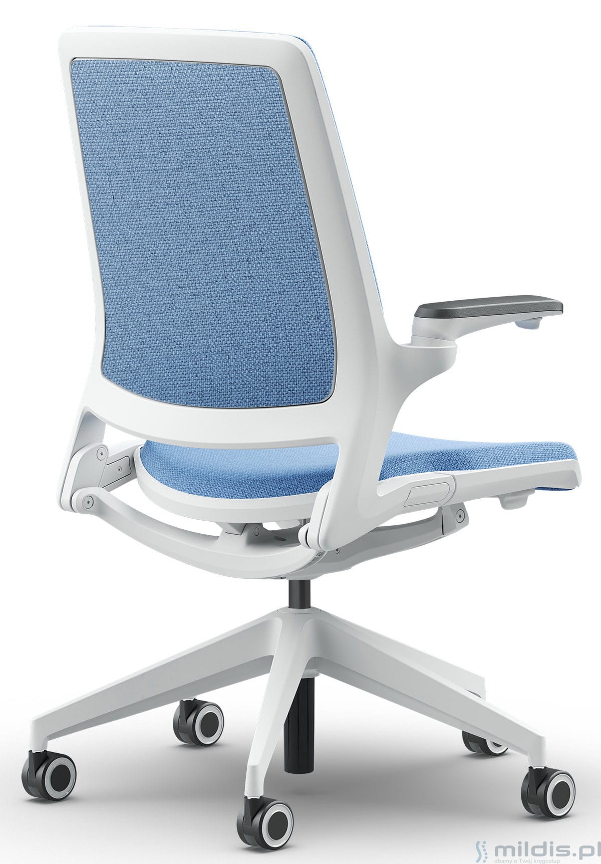 Smart Biały ma jednak stelaż oparcia, siedziska i podstawę jezdną w odcieniu bieli. Zastosowano również biało-czarne kółka. Dzięki temu ma bardziej designerski, nowoczesny wygląd i pasuje do wnętrz innego stylu niż czarna wersja tego modelu.