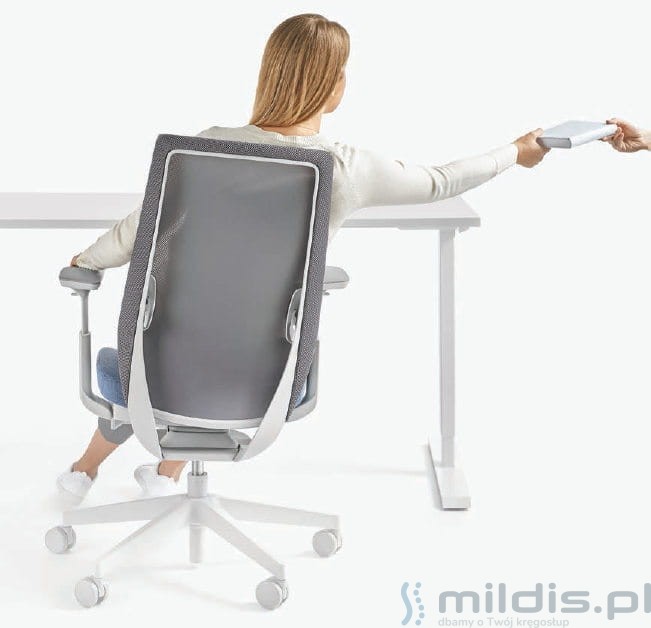 - Ta innowacyjna budowa wspiera płynną pracę pleców podczas ruchów bocznych i skrętnych wykonywanych w pozycji siedzącej. To znacznie obniża naprężenia i przeciążenia, jakie musi znosić w tym czasie kręgosłup. Tym samym niweluje ryzyko powstawania urazów i bólu pleców.