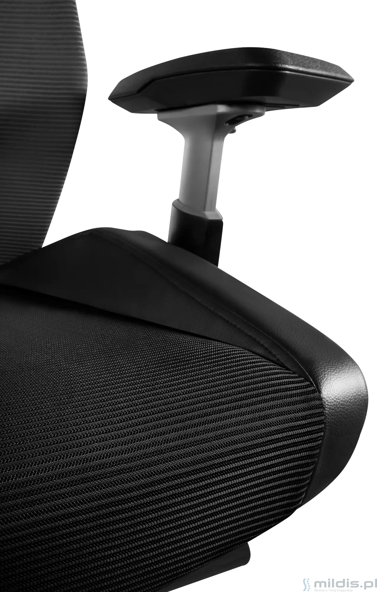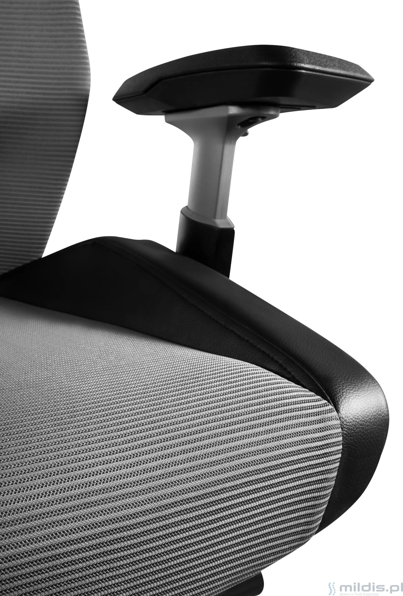 Siedzisko pokryte przewiewną siatką materiałową. Profilowane z obu boków - pomaga zachować bardziej prawidłową pozycję, siedzieć na środku i nie przechylać się na boki. Boczne profile siedziska obite skórą ekologiczną. Do wyboru siatka szara lub czarna.