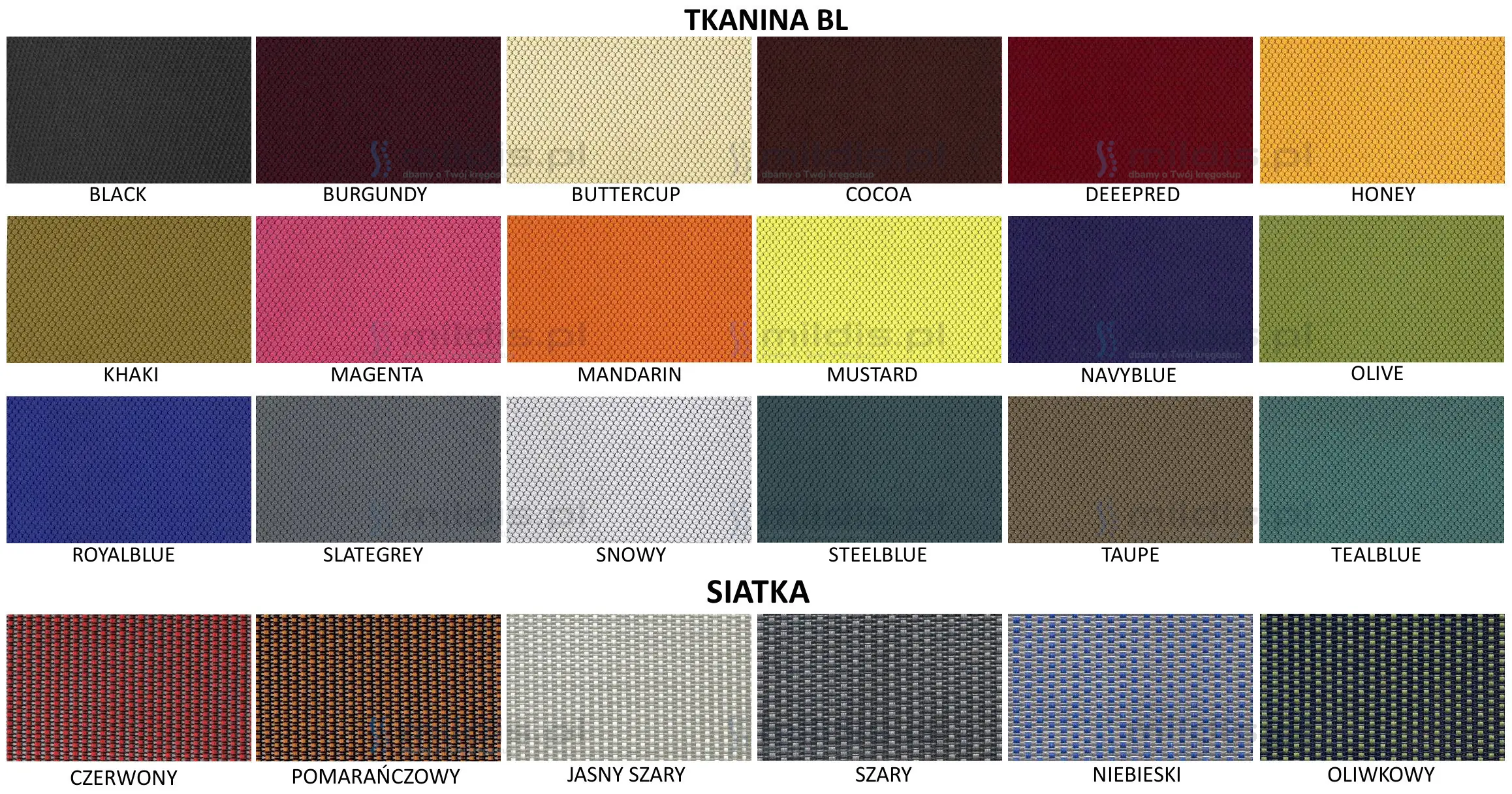 - Oparcie, siedzisko i zagłówek wykonane z materiałowej siatki zapewniającej stałą, dobrą wentylację ciała lub z eleganckiej, odpornej na ścieranie tkaniny.