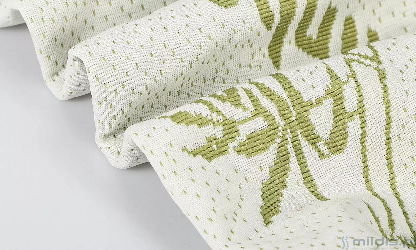 Pokrowiec na poduszkę jest wykonany z miękkiej dzianinowej tkaniny. Posiada w składzie włókna bambusowe zwiększające miękkość i jednocześnie podnoszące odporność na peeling (mechacenie, kulkowanie). Poszewkę cechują: